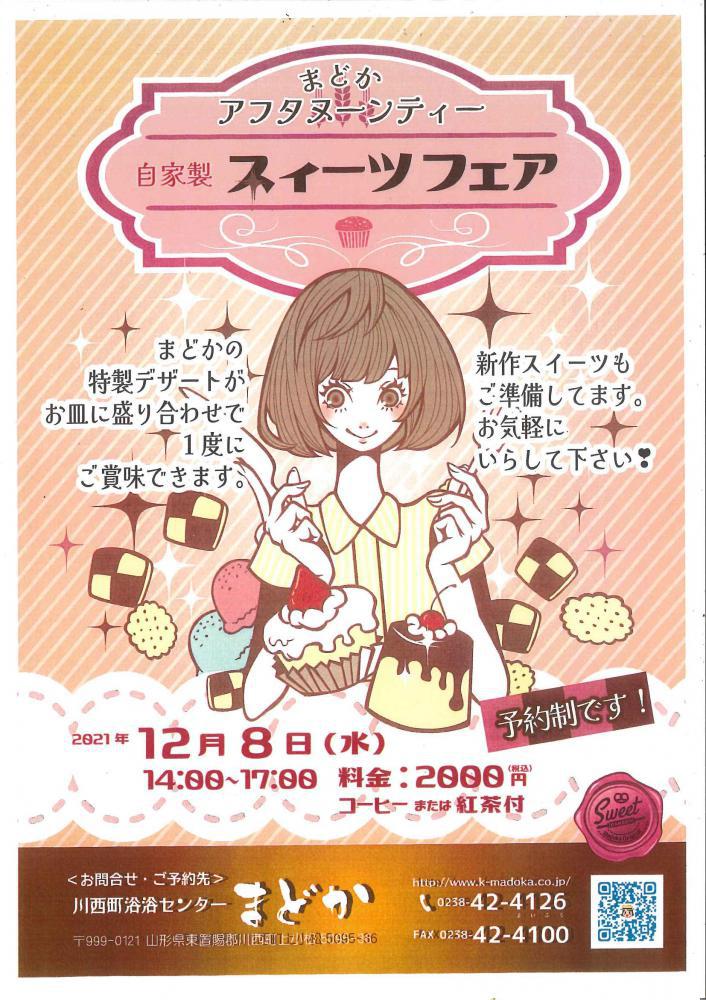 まどかアフタヌーンティー自家製スイーツフェア日時:2021.12月8日(水)時間:14:00〜17:00場所:まどか大輪料金:2,000円税込み予約制まどかの特製デザートがお皿に盛合せで1度に賞味できます。新作スイーツもご準備してます。お友達と午後のお茶タイムゆっくり過ごしてみませんか?※感染症対策も引き続き継続して行っております。すべてまどかの自家製です。スイーツのみは初めて行います。皆さま是非参加してみませんか?
