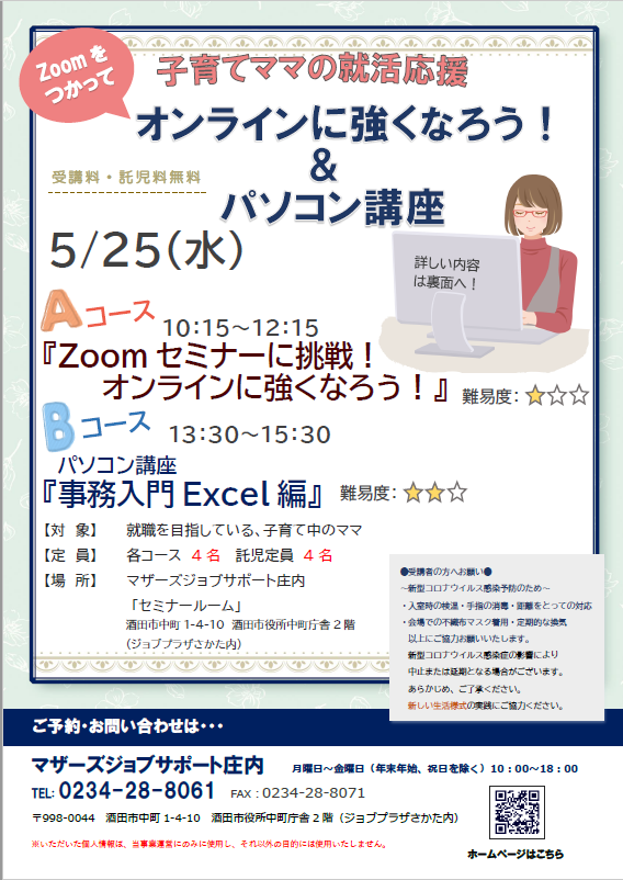 ☆マザーズジョブサポート庄内主催☆ 『オンラインに強くなろう! &パソコン講座』のお知らせ ≪Aコース≫ 5月25日(水)10:15〜12:15『Zoomセミナーに挑戦! オンラインに強くなろう!』難易度:★オンラインセミナーってどんなもの?オンラインセミナー受講のために、準備することは?パソコンで体験しながら「オンライン」を学べるセミナーを準備しました!一緒にZoomを使って「オンライン」に強くなりましょう♪◆インターネット環境について◆ご希望の方は、個人のスマートフォンを使い実際に操作を体験できますが、通信料は自己負担となります。ご了承ください。 ≪Bコース≫ 5月25日(水)13:30〜15:30『事務入門(Excel編)』難易度:★★事務のお仕事にも、一般・経理・労務など様々です。それぞれどのようなパソコン作業があるのかを確認していきます。実際にエクセルで、関数を利用し請求書を作成します。 ♪片方のコースのみ、両方のコース、どちらの受講でも可能です♪※本セミナーは「雇用保険受給中の求職活動実績」として認められます。 【対 象】就職を目指している子育て中のママ※就職活動前で何かを始めたいママもOK【会 場】マザーズジョブサポート庄内 セミナールーム【料 金】受講料 及び 託児料 無料【定 員】先着4名 ※お申込みが必要です。【託 児】定員4名 ※事前登録・予約が必要です。 保育ルーム開室日【水・木・金】の 10:00〜16:00に登録にお越し下さい。 ※併設の保育ルームで、保育スタッフが お子さんをお預かりします。 ママは安心して受講いただけます。 【駐車場について】お車でお越しの際は、中町庁舎脇にあるセントラルホテル契約駐車場をご利用ください。(ジョブプラザさかたと表示してあります。)※契約駐車場が満車の場合は、酒田市中央地下駐車場をご利用ください。無料駐車券(最大2時間)を発行いたします。お帰りの際に、コンシェルジュ窓口へお声がけください。 ★★受講者の皆様へお願い★★〜新型コロナウイルス感染予防のため〜・入室時の検温・手指の消毒・距離をとっての対応・会場での不織布マスク着用・定期的な換気 以上にご協力お願いいたします。 新型コロナウイルス感染症の影響により 中止または延期となる場合がございます。 あらかじめ、ご了承ください。 新しい生活様式の実践にご協力ください。★★ーーーーーーーーーーーー★★どうぞ、お気軽にお問い合わせくださいね。 ◇お申込み・お問い合わせ◇マザーズジョブサポート庄内TEL:0234-28-8061メールでのお申込みはコチラ