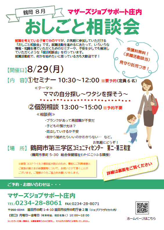 ☆マザーズジョブサポート庄内主催☆『ママの自分探し〜ワタシを探そう〜』のお知らせです。【日 時】8月29日(月)10時30分〜12時【開催場所】鶴岡市第三学区コミュニティセンター 第二・第三和室(鶴岡市泉町5-30   総合福祉センターにこふる隣接) 【内容】10:30〜12:00 セミナーテーマ「ママの自分探し〜ワタシを探そう〜」自分自身のことを理解することからお仕事探しはスタートします。得意なこと、苦手なこと、長所と短所など、自分の棚卸しをして、「ワタシをアピールできること」を身につけましょう。※お申込みが必要です。13:00〜15:00 個別相談・おしごとに関するお悩み・子育てに関すること・仕事と家事、子育てとの両立         など、お気軽にご相談ください。 ※どなたでもご利用いただけます、   お申込みは不要です。  ★★受講者の皆様へお願い★★〜新型コロナウイルス感染予防のため〜・入室時の検温・手指の消毒・距離をとっての対応・会場での不織布マスク着用・定期的な換気 以上にご協力お願いいたします。 新型コロナウイルス感染症の影響により 中止または延期となる場合がございます。 あらかじめ、ご了承ください。 新しい生活様式の実践にご協力ください。★★ーーーーーーーーーーーー★★ どうぞ、お気軽にお問い合わせくださいね。 ◇お申込み・お問合せ◇マザーズジョブサポート庄内TEL:0234-28-8061メールでのお申込みはコチラ
