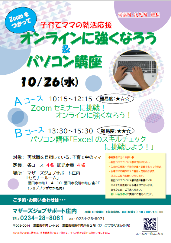 ☆マザーズジョブサポート庄内主催☆ 『オンラインに強くなろう! &パソコン講座』のお知らせ ≪Aコース≫ 10月26日(水)10:15〜12:15『Zoomセミナーに挑戦! オンラインに強くなろう!』難易度:★オンラインセミナーってどんなもの?オンラインセミナー受講のために、準備することは?パソコンで体験しながら「オンライン」を学べるセミナーを準備しました!一緒にZoomを使って「オンライン」に強くなりましょう♪◆インターネット環境について◆ご希望の方は、個人のスマートフォンを使い実際に操作を体験できますが、通信料は自己負担となります。ご了承ください。 ≪Bコース≫ 10月26日(水)13:30〜15:30パソコン講座『Excelのスキルチェックに挑戦しよう!』難易度:★★仕事で使えるExcelとは?実務で役立つ内容をギュッとまとめてご紹介します。自分が理解しているところとそうでないところが明確に。講師による解説を聞きながら理解を深めます。 ♪片方のコースのみ、両方のコース、どちらの受講でも可能です♪【対 象】就職を目指している子育て中のママ※就職活動前で何かを始めたいママもOK【会 場】マザーズジョブサポート庄内 セミナールーム【料 金】受講料 及び 託児料 無料【定 員】先着4名 ※お申込みが必要です。【託 児】定員4名 ※事前登録・予約が必要です。 保育ルーム開室日【水・木・金】の 10:00〜16:00に登録にお越し下さい。 ※併設の保育ルームで、保育スタッフが お子さんをお預かりします。 ママは安心して受講いただけます。 【駐車場について】お車でお越しの際は、中町庁舎脇にあるセントラルホテル契約駐車場をご利用ください。(ジョブプラザさかたと表示してあります。)※契約駐車場が満車の場合は、酒田市中央地下駐車場をご利用ください。無料駐車券(最大2時間)を発行いたします。お帰りの際に、コンシェルジュ窓口へお声がけください。 ★★受講者の皆様へお願い★★〜新型コロナウイルス感染予防のため〜・入室時の検温・手指の消毒・距離をとっての対応・会場での不織布マスク着用・定期的な換気 以上にご協力お願いいたします。 新型コロナウイルス感染症の影響により 中止または延期となる場合がございます。 あらかじめ、ご了承ください。 新しい生活様式の実践にご協力ください。★★ーーーーーーーーーーーー★★どうぞ、お気軽にお問い合わせくださいね。 ◇お申込み・お問い合わせ◇マザーズジョブサポート庄内TEL:0234-28-8061メールでのお申込みはコチラ 検索の際は是非こちらでも試してください♪#マザーズジョブサポート庄内#鶴岡市#酒田市#マザーズハローワーク#保育ルームきらきら#にこっと#お仕事#PC講座#子供預ける#不安#両立#セミナー#求職活動