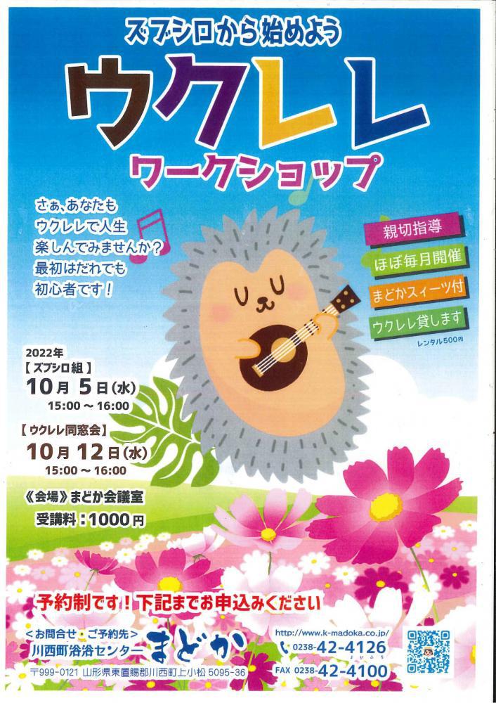 ズブシロからはじめよう♪ウクレレワークショップ★ズブシロ組・・・9月7日(水)・・・15:00〜16:00★卒業組・・・9月14日(水)・・・15:00〜16:00受講料:1,000円(まどか特製スイーツ付)※ウクレレレンタル出来ます(レンタル500円)・親切指導 ・ほぼ毎月開催※まどか会議室さああなたもウクレレで人生楽しみませんか?お申込み先:浴浴センターまどか   TEL0238-42-4126
