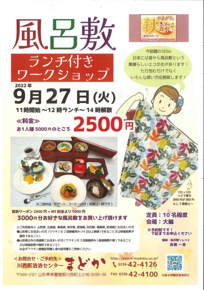 好評に付き9月も開催いたします。2022年9月27日(火) ※完売いたしました!!=秋旅キャンペーン特別企画= 風呂敷ランチ付きワークショップ11時〜ワークショップ12時〜ランチ〜14時解散料金:2,500円税込み会場:まどか大輪(宴会場)定員:10名程度※夏旅キャンペーンのクーポン2000円とワークショップ1,000円で3,000円分で お好きな風呂敷をお買い上げ頂き、参加となります!!※参加にはワクチン接種証明書と身分証明書が必要となります!!※予約制です。浴浴センター まどか  TEL:0238-42-4126までお申込み下さいませ!!