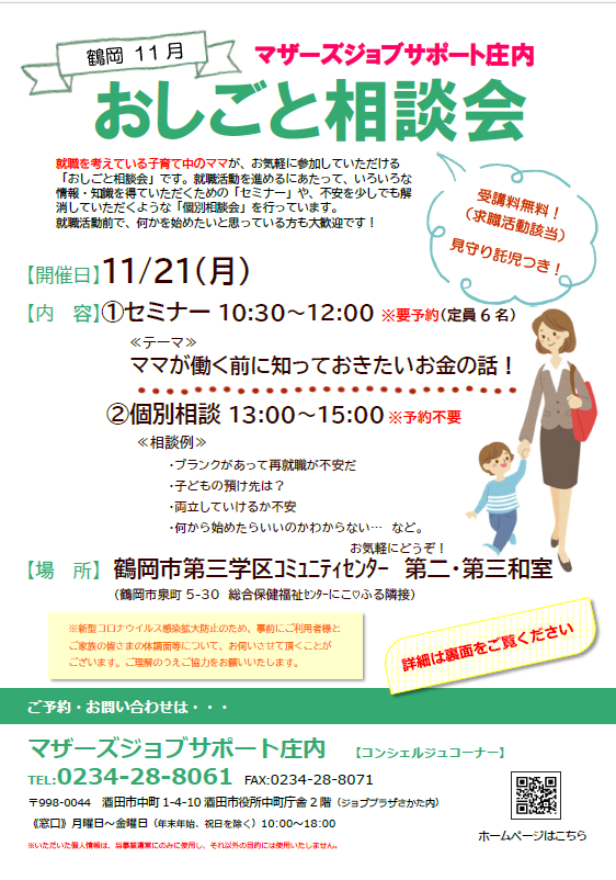 ●11月マザーズおしごと相談会in鶴岡開催のお知らせ 11/17追記