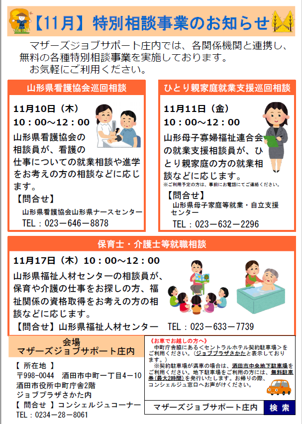 マザーズジョブサポート庄内では、各関係機関と連携し、各種特別相談事業を実施しております。ぜひ、ご利用ください。 山形県看護協会巡回相談 【要予約】日 時 11月10日(木)10:00〜12:00場 所 マザーズジョブサポート庄内 セミナールーム問合せ 山形県看護協会 пF023-646-8878HP:http://www.nurse-yamagata.or.jp/ 看護の仕事への復職をお考えの方、お気軽にご相談ください。 保育士・介護士等就職相談 ※お申し込み不要日 時 11月17日(木)10:00〜12:00場 所 マザーズジョブサポート庄内 セミナールーム問合せ 山形県福祉人材センター пF023-633-7739HP:http://www.ymgt-shakyo.or.jp/jinzai/保育士・介護士・看護師など資格をお持ちの方や、資格取得を目指している方、福祉職にご関心のある方は、お気軽にお越しください。 ひとり親家庭就業支援相談 [要予約]日 時 11月11日(金)10:00〜12:00場 所 マザーズジョブサポート庄内 セミナールーム *コロナの状況により、オンライン開催となります。問合せ 山形県母子家庭等就業・自立支援センター пF023-632-2296HP:http://www.y-boshi.com/self-support/ひとり親家庭の方や今後について考えている方、どうぞお気軽にご相談ください。 ※各相談会について、利用ご希望の方は、マザーズジョブサポート庄内までお気軽にお声掛けください。※ご相談の際、お子さまの託児は『保育ルーム きらきら』をご利用いただけます。託児ルームのご利用には、事前のご登録が必要です。 【駐車場について】お車でお越しの際は、中町庁舎脇にあるセントラルホテル契約駐車場をご利用ください。(ジョブプラザさかたと表示してあります。)※契約駐車場が満車の場合は、酒田市中央地下駐車場をご利用ください。無料駐車券(最大2時間)を発行いたします。お帰りの際に、コンシェルジュ窓口へお声がけください。 ◇お申込み・お問い合わせ◇マザーズジョブサポート庄内TEL:0234-28-8061メールでのお申込みはコチラ
