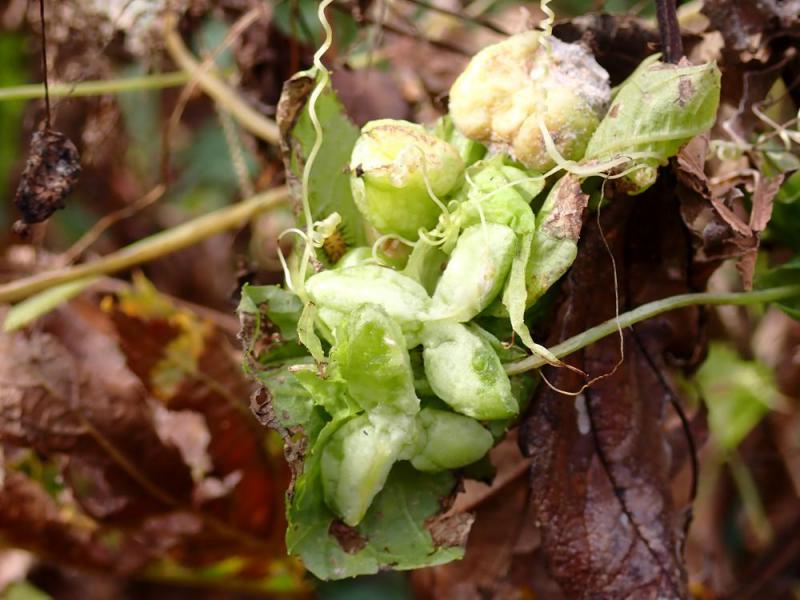 温室の奥には種子を残し、ぎりぎりに光合成を営むけなげなニガウリの葉達。