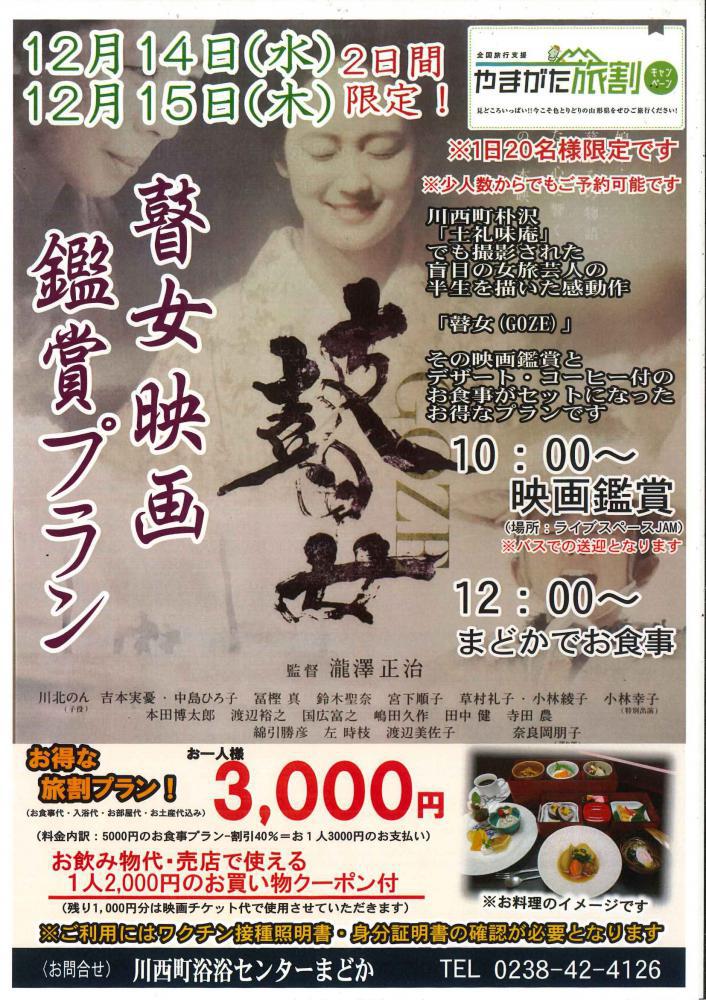 12月14日(水) 15日(木)2日間限定! 両日定員20名「瞽女」映画鑑賞プラン ・10:00〜映画鑑賞(ライブスペースJAM) ・12:00〜昼食 お一人様5000円コース(昼食代・入浴代・お部屋代・プチお土産付き)→3,000円 ※旅割CP使用の為、ワクチン接種証明・身分証お持ち下さい。 ※お飲み物代・売店で使える2,000円クーポン付き ※1000円は映画のチケット代で使用させていただきます※予約制となります。お申し込みは0238-42-4126まで