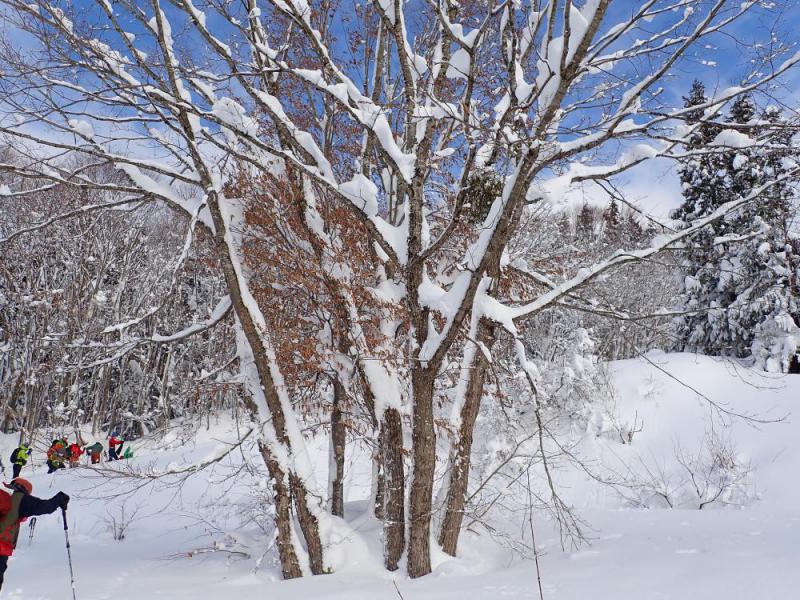 樹木に花が咲いた様に粉雪の付着です。これを「キズリかかる」といいます12月には珍しい晴天で澄み渡りました。