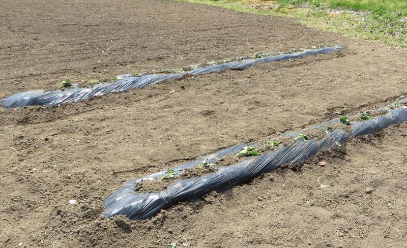 5月17日(水)、今日は畑で作業をする学年が多くありました。まずは1・2年生。サツマイモの苗を植えました。マルチの穴が開いている部分に、苗をそうっと寝かせ、土をかぶせて出来上がり。満面の笑顔。上手に植えることができたようです。秋には収穫したサツマイモを使って、飯豊少年自然の家で焼き芋体験を行う予定です。―――――――――――――――――――――――――――――――――――――――――――――――こちらは6年生。等間隔に開けられた畝の穴にジャガイモの種芋を植えていきます。よく見ると…子供たちが植えているのは、2つの品種のジャガイモのようです。収穫したら食べ比べができそうですね!ちなみに、こちらは一足先に植えた理科実験用のジャガイモ。順調に育っています (∩_∩)――――――――――――――――――――――――――――――――――――――――――――――――さて、お次は3年生。畑の先生・小松勝美さんをお招きし、「岡の台ごんぼ」の学習を兼ねた種植え作業です。まずは、先生からお話をお聞きしたり、質問したりしながら理解を深めます。その後、畑に移動し、植え付け作業開始です。紐状になっているオブラートの中には、コーティングされた種が等間隔に入っています。それを畝の溝の中に入れ、みんなで土をかぶせていきました。もう1つの畝では、便利な道具を使って植える様子を見せていただきました。溝もない畝の上をすうーっと通過するだけで、あっという間に終了。「えっ?本当に植えたの?」「何も変わってないけど…」確認のためにちょっと土を掘っていただくと…「おーっ、本当にあった!」驚きの声があがりました 。3年生は、引き続き本地区の伝承野菜「岡の台ごんぼ」の学習を進めていく中で、地域や特産物に対する理解と愛着を深めていきます。大変暑い中ご協力いただきました、畑の先生・小松さん、地域コーディネーター・村上さん、ありがとうございました。そして、本日ほぼ1日畑で各学年の子供たちの作業を支えてくださった小口先生、お疲れさまでした。