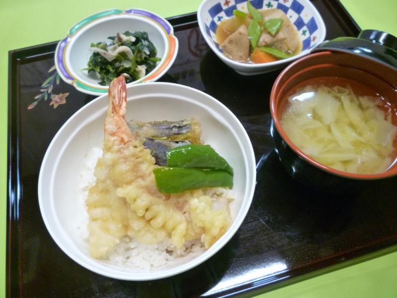 栄養課です。6月のお誕生メニューの紹介をします。天丼 かぶとがんもの煮物ほうれん草の姫ゆば和え味噌汁でした。天丼は人気メニューのひとつで入所者の皆様は喜んで食べておられました。