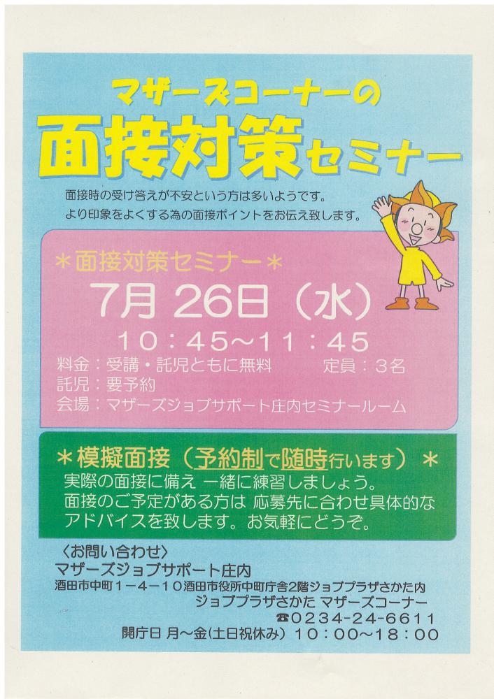 7月マザーズジョブサポート庄内  求職支援セミナー『マザーズコーナーの  面接対策セミナー』 を行います!  このセミナーは 「面接は久しぶりなので不安だなぁ」 「子どもに関する質問に  どう答えればいいんだろう?」 面接が心配or苦手…  という方におすすめ! 面接への不安を解消するために より印象をよくする為のふるまいや 受け答えについてポイントをお伝え します。   ハローワークマザーズコーナーでは 定期的にセミナーを開催します。 奮ってご参加下さい。 受講後も疑問点など、 窓口にてご相談が受けられます。 【日 時】 7月26日(水) 10時45分〜11時45分【対 象】 お仕事探し中の子育てママさん【会 場】 マザーズジョブサポート庄内  セミナールーム【料 金】 受講料 及び 託児料 無料【定 員】先着3名 ※お申込みが必要です。【託 児】定員3名 ※事前登録・予約が必要です。 ※併設の保育ルームで、保育スタッフが お子さんをお預かりします。 ママは安心して受講いただけます。                【駐車場について】 お車でお越しの際は、中町庁舎脇にある   セントラルホテル契約駐車場をご利用ください。 (ジョブプラザさかたと表示してあります。) ※契約駐車場が満車の場合は、 酒田市中央地下駐車場をご利用ください。 ご利用の方は、無料駐車券を(最大2時間) を発行いたします。 お帰りの際に、マザーズ窓口へお声がけください。※模擬面接 (予約制で随時行います) 面接のご予定がある方は応募先に合わせ具体的な アドバイスを致します。  どうぞ、お気軽にお問い合わせくださいね。  ◇お申込み・お問い合わせ◇ マザーズジョブサポート庄内 TEL:0234-24-6611(ハローワークマザーズコーナー) TEL:0234-28-8061(コンシェルジュコーナー)