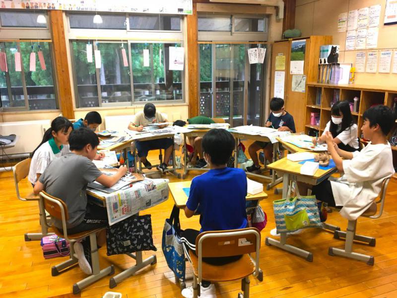 6年生の図工の様子です。机を輪の隊形にして、集中して絵画に取り組んでいました。細部までしっかりと彩色をしていたところが、さすが6年生だと思います。絵画が終わった子は、粘土で高さを感じられる作品を作っていました。