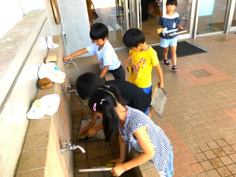 朝の学級の時間を使って、1年生が靴箱の掃除を行っていました。小ぼうきを使って埃を落とし、水洗いした後新聞紙で拭き取ります。みんな手際よく上手に、そしてきれいにして終えることができました。靴箱も気分もスッキリして、夏休みを迎えられそうです。