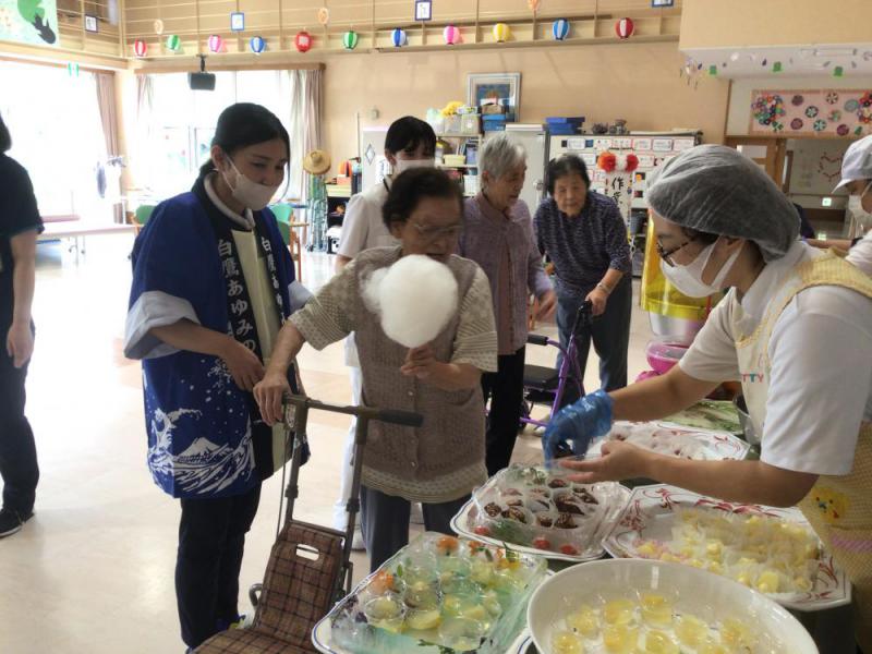 こんにちは!あゆみ入所です!8月9日水曜日に夏祭りをおこないました!様々なレクの後用意したお菓子を食べました。リハビリスタッフや栄養課の方々にも協力してもらい、御利用者様の笑顔あふれる夏祭りになりました!