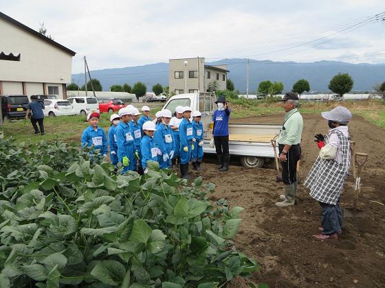 9月26日(火)、3年生が春から育てていた岡の台ごんぼの収穫を行いました。5月の中旬に種植えをしたゴボウはどんな立派な姿になっているかドキドキです。春からお世話になっている小松先生(畑の先生)に収穫の仕方をお聞きし、いざ挑戦!最初は威勢よく土を掘り進めるも、どこまで掘っても抜ける気配がありません。時折「ポキッ」という音とともに、「あ〜折れちゃった。」とため息交じりの声も聞こえてきます。それでも、参加してくださった大人の方に手伝ってもらいながら、なるべく根部を完全に掘り取ろうと、必死に側面を掘り下げていきます。すると、ようやく・・・「とったぞ〜!」という声が少しずつ聞こえるようになりました。頑張って掘り続けたかいがありましたね♪ そして、手作業による収穫はとうとう時間切れ。手で掘り取る大変さを体験したところで、残りは機械を使って一気に引き抜きます。トラクターが通過すると、あっという間に地中深く根を張っていたごぼうが地上に姿を現し、子供たちからも歓声が上がります。今年のごぼうは、例年になくいいできだったようで、小松先生も驚いておられました。この後の調理も楽しみですね。ご指導いただきました小松先生、お手伝いいただきました梅津さん、今日はどうもありがとうございました。なお、本日の収穫の様子は山形新聞社さんとNHKさんの取材が入っております。それぞれ、・山形新聞・・・明日の新聞に掲載予定・NHK・・・本日夕方(やままる 18:10)に放送予定とのことです。こちらもお楽しみに!