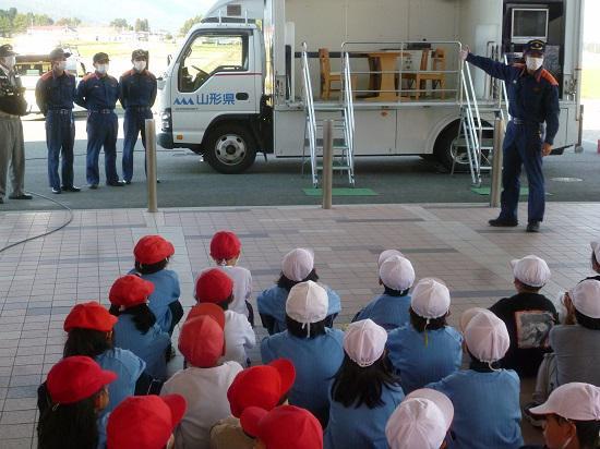 10月25日、山形県に1台しかない地震体験車(起震車)を使った模擬体験を行いました。これまでも校舎や活動場所から避難する訓練を行ってきましたが、揺れを体験するのは初めて。1年生から6年生まで貴重な体験をすることができました。はじめに消防署の方から、どこを、どのように守るのかお話をお聞きした後、4人1組で車に乗りこみました。一っ子達は、お聞きしたことを思い出しながら、机の下にもぐり、机の脚をしっかりとつかみ、自分の身を守っていました。災害はいつ起こるかわかりません。万が一の時には、今日の訓練を思い出して、自分の身は自分で守れる一っ子になってほしいと願っています。