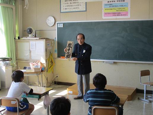 昨日の続きです。4年生が、一人ひとり芸名を書いていただいた木札をいただいた場面です。 みんな、自分が考えた芸名を、とてもとても上手に書いていただいたものを手にして、うれしいような、恥ずかしいような気持ちでした。 見ているこちらまで、「うふふ」の気持ちになりました。この取り組みをしていただいてから3年目。4年生の皆さん、期待していますよ!