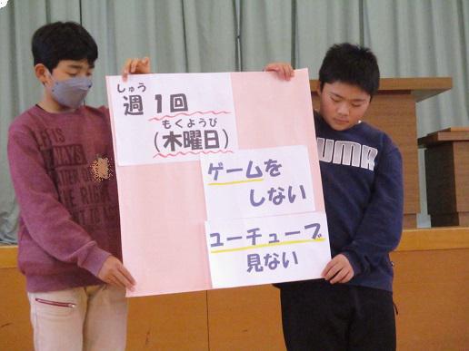 先週も書いた内容ですが、今日の朝会で、図書委員、生活委員、運営委員から素晴らしい決議の結果報告がありました。写真の通りです。図書委員会からは、本を読む人が少ないので、ぜひ本を読んでほしい。生活委員会からは、心も体もむしばむゲームやユーチューブの時間を減らすために全校生で考えてほしいという提案がなされ、各学年で討議。その後、先週の代表委員会で決まったもの。 今までノーメディアデイは、教職員や町全体で行っていた年2回でした。それを、子どもたちで、週1回にしたのです。 先日の就学時健診の講師の先生も、校医の先生も、いかに生活リズムや早寝 早起き 朝ごはん、快眠、快食、、快便が大事かというお話をなされました。人も動物なので、この便利な世の中ですがいかに自然に近い生活をするか‥ということをおっしゃっていました。 これから様々な葛藤が出てくることでしょう。それと戦いながら自己調整ができたとき、それはきっと人生をも変える結果になるはずです。(詳しくは、明日の学校通信をお読みください。) 図書委員も早速、おすすめ読書の話をしていました。 これからが楽しみです。