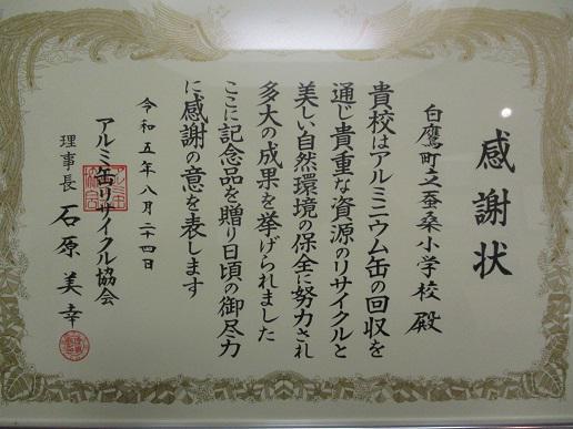 今日、酒田からアルミ缶リサイクル協会の方がお越しになり、蚕桑小学校に感謝状をいただきました。蚕桑小学校がずっとアルミ缶のリサイクル活動を行っていることに対して、全国で約40校の表彰対象になったのです。感謝状をいただいたのは、こぐわっ子たちや地域の方々が持ってきてくださるアルミ缶をつぶしたりなど、管理しているエコボランティア委員会の6年生。雨の日も風の日も雪の日も、しっかり仕事を頑張っているエコボランティア委員会です。 委員長が、しっかり今までの取り組みや100周年の取り組みについて、お話をしました。 感謝状を届けてくださったOさんは、ぜひこの取り組みを続けてほしいとおっしゃっていました。子どもたちのことで鼻が高〜くなった日でした。 今後もリサイクル、リユース、リデュースの3Rで、地球沸騰化を軽減し、人様のお役に立ちたいものです。