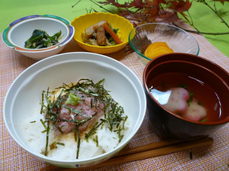 栄養課です。11月のお誕生日献立は、・ねぎとろ丼・うどの炒め煮・ほうれんそうとえのきのお浸し・柿・花麩のすまし汁でした。『ねぎとろ』とはまぐろの切身を取った後の骨のすきまにある身(中落ち)や、皮の裏の身をそぎ落として作っていたのが始まりで、『身をねぎ取る』という言葉から由来したと言われています。久しぶりの提供したねぎとろ丼に、「珍しいごど〜」と声があがり、皆さん美味しく召し上がっていました。