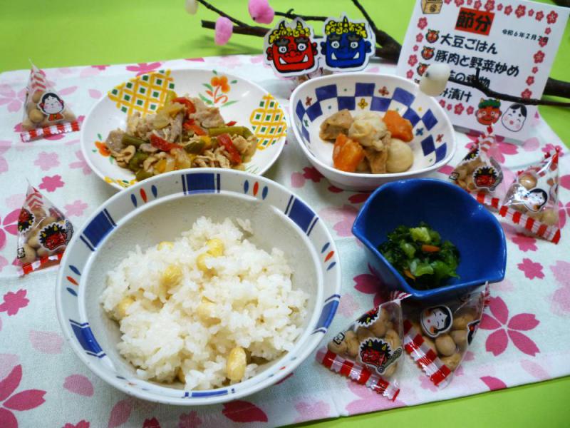 栄養課です。 節分に「大豆ごはん」を提供致しました。穀物には鬼や邪気を追い払う力があると言われているそうです。五穀豊穣を祈って、豆まきをしました。