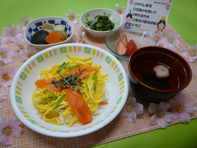 栄養課です。3月だというのに外は雪景色で、冬に逆戻りですね。今回はひな祭りに提供した献立を紹介します。・ちらし寿司・花麩のすまし汁・里芋の炊き合せ・菜の花の姫ゆば和え・苺「うわーきれいだな」「美味しいよー」など、声を掛けて頂きました。色彩を目で楽しんで、味覚を味わう。完食して下さるのが一番の励みです。