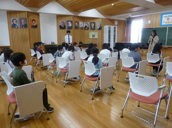 3年生になると、リコーダーを使った音楽の学習が始まります。4月23日、リコーダーの先生をお招きし、リコーダーの仲間の紹介や、穴のふさぎ方、扱い方などについて、詳しく教えていただきました。最初はあいさつ代わりにリコーダーを使って、ジブリの曲など、おなじみの曲を数曲演奏してくださいました。「あっ、聞いたことある!」と、体を横に揺らしながら、楽しそうに聞き入っていました。そのあと、穴のふさぎ方や息の吹き方など練習し、実際に音を出してみました。いろんな曲がふけるようになりたいと目を輝かせる3年生でした。最後には、2種類のリコーダーの仲間を紹介し、それぞれを使って演奏していただきました。今日お習いしたことを忘れず、リコーダーの勉強を頑張っていきます!【講師の鈴木先生 フルートがご専門だそうです。】【あいさつ代わりの模範演奏】【穴をふさぐ指の練習】【自由の女神!?】【実際に音を出してみます。】【リコーダーの仲間 その1:アルトリコーダー】【リコーダーの仲間 その2:ファイフ】