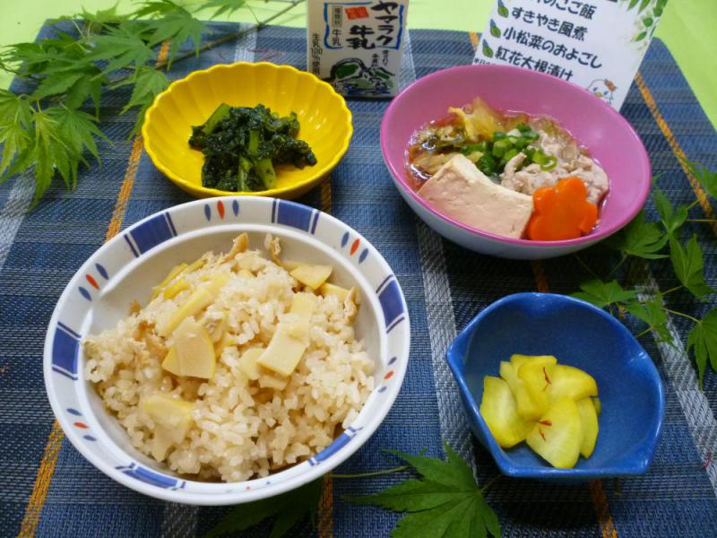 栄養課です。 町内農産物の利用促進活動の一環として、白鷹町の食材をふんだんに使用した「しらたかの日」の行事食を行っています。 今回のメニューは・たけのこご飯・すき焼き風煮・小松菜のおよごし・紅花大根漬け・牛乳たけのこご飯のたけのこや油揚げ、すき焼き風煮の豚肉、ねぎ、糸こんにゃく、豆腐、小松菜、紅花大根漬け、牛乳は白鷹産のものを使用しました。本日の豚肉は白鷹産ですとお伝えすると、「豚肉もが〜!」と驚いた様子でした。皆さん、地域の食材を味わっておられました。