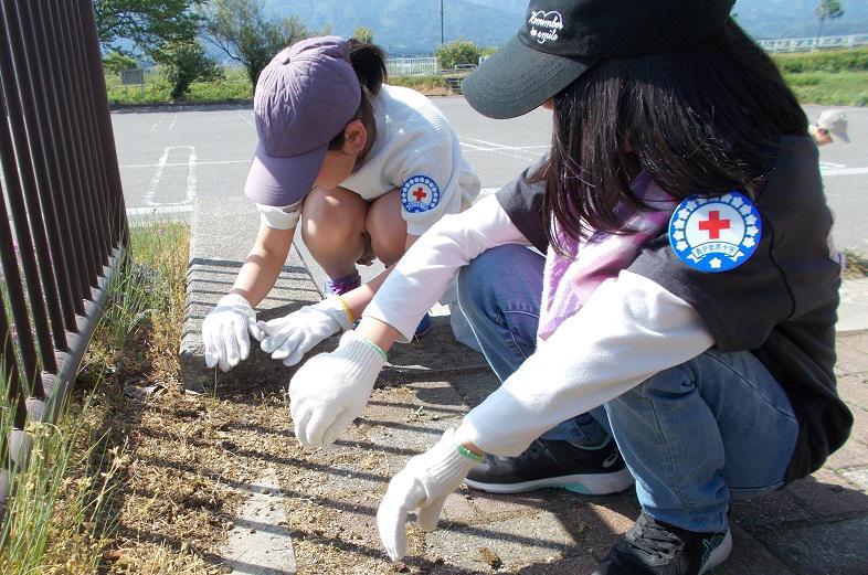 5月10日(金)、午後から全校一斉の奉仕活動を行いました。子供会ごとに活動場所を決め、それぞれゴミ拾いや草むしり等に取り組みました。 ちょうど前日、今年度の青少年赤十字加盟登録式を行ったところですが、今回の活動はその一環でもあります。青少年赤十字が態度目標に掲げている「気づき・考え・実行する」についても紹介しましたが、本校でも特に大事にしていきたい部分です。今後もこのような活動を通して「他人や地域のために役に立ちたい」という思いを素直に行動に移せるような子供たちを育てていきたいと思います。