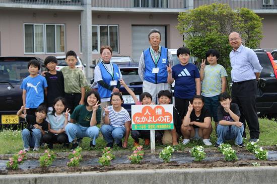 6月4日、人権の花植えを行いました。当日は、町の方から2名の人権擁護委員の方々をお招きし、きれいなベコニアの花を花壇に植えることができました。例年、児童会の生活委員会がこの活動を行っており、植え方をお聞きしながら、ていねいに作業していました。今では毎朝、生活委員の子ども達が校門をくぐると、すぐにじょうろを使って水かけをおこなっています。「美しい心」がすくすくと育ってきています。