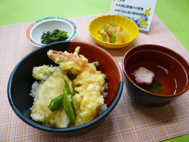 栄養課です。あゆみの園では約30%のお父さん入所者がいらっしゃいます。今まで一生懸命働いてきたお父さん入所者の方に感謝の意を込めまして、「父の日天丼」を提供いたしました。大きい海老天に感激された方もいらっしゃって、大変喜ばれておりました。