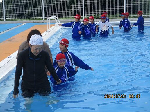2・4・6年生の着衣泳。まずは、体ならし。 6年生は、余裕でしょうか。 はい、浮いてみよう! 上手上手! 4年生、歩いてみよう〜! うっぷ! わ〜〜! 2年生は、ビート板を使って! 前に進むか〜い!? 4年生も服に空気を入れて、浮いてみました。その調子その調子! あらら、沈んでいるのは だあれ? プールの中では流れがないので、比較的浮いたり泳いだりできましたが、海や川はそうはいきません。夏休みは、十分に気を付けて遊んでくださいね!