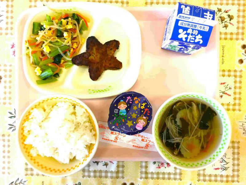 本日の給食は、7日の七夕にちなんで「七夕こんだて」でした。メニューは・・・星ハンバーグケチャップソース、チーズ入りおひたし、七夕汁、七夕ゼリー、ごはん、牛乳でした。1年生の教室では、ほとんどの子が食べ終わりそうでした。やはりおいしかったようです。いろいろなところに星がちりばめられ、見た目にもきれいな献立でした。ごちそうさまでした。
