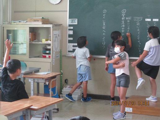昨日の3年生の学級活動。 それが今日の代表委員会につながっています。 各学年の反省は、もうTEAMSでみんなが見られる状態。それを読んで、学校全体で次に取り組みたいことを考え、意見を述べています。 今までは、各学年の反省を黒板に書くのが精一杯でした。 今年はタブレットを使い、時間短縮とともに、課題について語り合う、練り合うことを狙っています。まだまだこれから慣れていく必要がありますが、創立101年目、子どもたちは、様々な委員会で新しい取り組みをすることと、今日のような仕組みを確立することに力を注いでいます。 自治活動は、一人ひとりが自分の考えをもって建設的な意見を言い合い、お互いに切磋琢磨し合い、生活も充実してくるというものです。それには、常にアンテナを張り、その集団をよくするためには…と考えていなければいけません。 昨年度の下地に、さらに本格的な自治活動をしようという試み、どこまで子どもたちが伸びていけるか楽しみです。