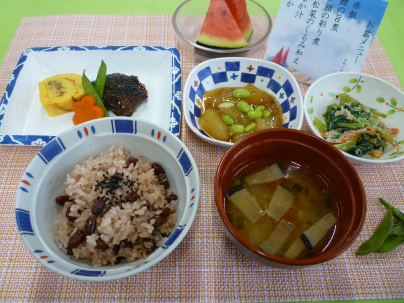 栄養課です。厳しい夏が続いておりますが、皆様体調など崩されていないでしょうか?当施設では「お盆メニュー」としまして、・お赤飯・鯉の甘煮・夕顔の彩煮・小松菜のくるみ和え・いるか汁・すいか お品々提供致しました。暑い夏を乗り越えてるために沢山食べて頂き、元気に過ごして頂きたいです。