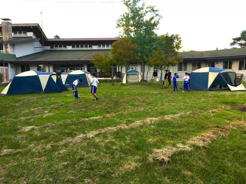 宿泊学習1日目の4時過ぎの様子です。テントを張ってトーチ棒も作り終わり、テントで休憩です。夕食まで時間があったため、フィールドアスレチックをすることになりました。みんなとても楽しそうです。先生の話もよく聞いて活動しており、スローガンどおりの宿泊学習になっています。