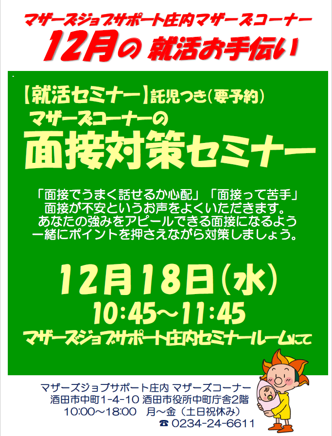 12月 マザーズジョブサポート庄内  マザーズハローワークコーナー☆☆☆☆☆☆☆☆☆☆☆☆☆☆☆☆☆☆☆☆求職支援セミナー『面接対策セミナー』を行います! このセミナーは就職への第一歩!「面接でうまく話せるか心配」「面接って苦手」と感じている方あなたの強みをアピールできる面接になるよう一緒にポイントを押さえながら対策しましょう☆☆☆☆☆☆☆☆☆☆☆☆☆☆☆☆☆☆☆☆ ______________________模擬面接  ご希望に合わせ随時お受けいたします。 面接が久しぶりな方や苦手意識がある方に 特におすすめ、よくある質問をもとに練習し 具体的なアドバイスを致します。______________________ ハローワークマザーズコーナーでは定期的にセミナーを開催します。奮ってご参加下さい。 受講後も疑問点など、 窓口にてご相談が受けられます。  【日 時】12月18日 (水)10時45分〜11時45分【対 象】お仕事探し中の子育てママさん【会 場】マザーズジョブサポート庄内セミナールーム【料 金】受講料 及び 託児料 無料 ※お申込みが必要です。【託 児】※事前登録・予約が必要です※併設の保育ルームで、保育スタッフがお子さんをお預かりします。ママは安心して受講いただけます。                【駐車場について】お車でお越しの際は、中町庁舎脇にあるセントラルホテル契約駐車場をご利用ください。(ジョブプラザさかたと表示してあります。 )※契約駐車場が満車の場合は、酒田市中央地下駐車場をご利用ください。ご利用の方は、無料駐車券を(最大2時間)を発行いたします。お帰りの際に、マザーズコーナー窓口へお声がけください。  どうぞ、お気軽にお問い合わせくださいね。◇お申込み・お問い合わせ◇ マザーズジョブサポート庄内 TEL:0234-24-6611(ハローワークマザーズコーナー) TEL:0234-28-8061(コンシェルジュコーナー)