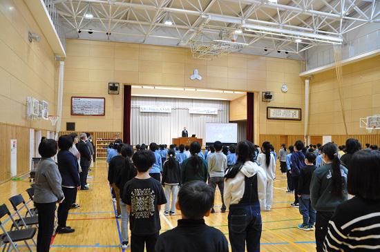 12月25日、2学期の終業式が行われました。インフルエンザ等により全員出席とはいきませんでしたが、元気な一っ子たちが体育館に一堂に会し、今学期の頑張りをたたえ合えたことをうれしく思います。これもひとえに、子供たちの健康を管理し、元気に学校生活を送ることができるよう、背中を押してくださった保護者並びにおうちの皆様の賜物と改めて感謝申し上げます。明日から子供たちが楽しみにしていた冬休みに入ります。この休みは日本文化に触れ、貴重な体験がたくさんできる13日間だと思います。安全に気を付けて、楽しく有意義な休みとなりますよう、心よりお祈りしております。皆様、どうぞよいお年をお迎えください。【児童代表あいさつ】【校歌斉唱】【終業式に先立って行われたゆり賞達成者】【終業式に先立って行われた読書賞達成者】