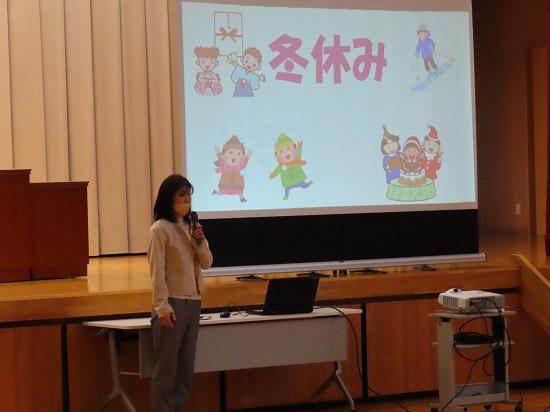 12月24日の全校集会で、担当から冬休みの暮らし方についてお話がありました。特に雪の事故や交通事故にあわないことについて、繰り返し指導しました。そのほか、お小遣い(お年玉)の使い方や生活リズムを守って生活することなど、具体的に話しましたので、おうちの皆様からもお声がけくださいますようよろしくお願いします。なお、お子さんを通じて「冬休みのくらし方」を配付しましたので、見える場所に掲示するなどして、参考になさってください。