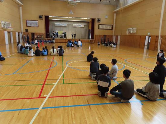 2月19日、児童会体育委員会主催の大縄跳び大会が行われました。今日まで、体育の時間や休み時間を使って、クラスごとに練習を重ねてきました。今日はいよいよ本番。各クラス2チームに分かれ、それぞれ跳んだ回数を合計し、数の最も多いチームが優勝となります。しかし、大縄跳び運動の経験年数や学年の運動能力差を考慮し、ハンデが設けられていました。(ハンデは、1年生300回、2年生240回、3年生180回、4年生120回、5年生60回、6年生0回)「用意、スタート!」の合図で一斉に跳び始めました。時間は3分間です。どのチームも、元気な声をかけながら一生懸命跳び続けていました。引っかかって縄が止まってしまっても、誰一人文句を言う人はいませんでした。一っ子たちの優しい子心、思いやりのある態度を垣間見ることができました。結果発表です。優勝は、1回目+2日目+ハンデ数564回を記録した4年生でした。ハンデなしの6年生は541回。これも素晴らしい大記録です。一つの目標に向かって、クラス一丸となって取り組んだこの大会は、実に意味のある活動になりました。みんないい顔をしていました!!【優勝して大喜びの4年生】