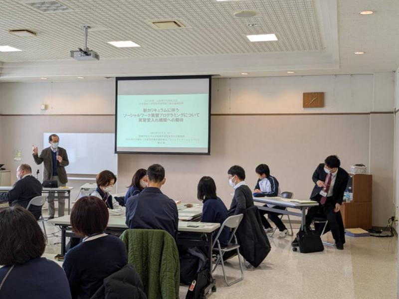 令和7年3月5日(水)、天童市総合福祉センターにて、山形県実習指導者情報交換会を開催しました。年度末という時期ではありますが、30名以上の実習指導者の方々よりご参加いただきました。令和3年度から社会福祉士の養成課程が新カリキュラムとなり、実習指導者として実践している社会福祉士の方からは「旧カリキュラムのときに実習指導者になったが、その後、学ぶ機会が無い」、「他の実習指導者が、どのような実習受け入れをしているのか分からない」、「基本実習プログラムの作成方法が分からない」といった悩みの声を多数耳にしていました。そのような中、実習指導者のネットワーク構築と資質向上を目的として、実習指導者の情報交換会を開催いたしました。宮城学院女子大学の熊坂聡先生による新カリキュラムにおける実習プログラムの作成のポイントと実習施設への期待等のご講演いただきました。その後、米沢市役所の秋友和さん、山形市社会福祉協議会の多田祥子さんからの実践報告、実習指導者どうしによるグループワークと、内容盛りだくさんではありましたが、あっという間の2時間半でした。参加者からは、「基調説明や実践報告が大変参考になった」、「実習指導者講習会以来、初めて実習をテーマとした活動に参加できてよかった」、「他の施設でどのように受入れしているか分かった」、「受入れは大変だが、取り組まなければならないと感じた」、「これからも参加したい」という声をいただきました。実習指導は、次の世代の社会福祉士、ソーシャルワーカーを養成する取組み、そして、実習指導者が自らの業務に含まれるソーシャルワークを振返り、学ぶ機会でもあると思います。来年度以降も、実習指導者に関する活動を開催しますので、ぜひご参加ください。