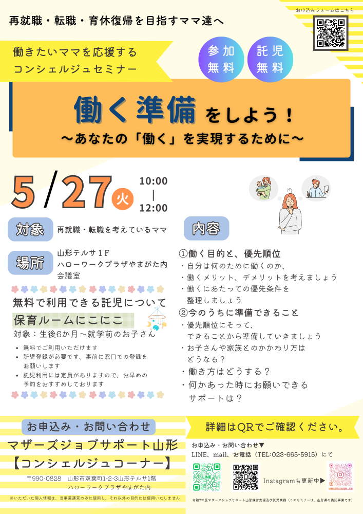5月のコンシェルジュセミナーのお知らせです!『働く準備をしよう! ―あなたの「働く」を 実現するために―』*.:・.。**.:・.。**.:・.。**.:・.。**「そろそろ就活を始めたい!」でも、いざ始めるとなると何から始めたらいいのかわからない…そんなママはいませんか?・働く目的・働くメリットと心配なこと・仕事を決める優先条件これらの大切なポイントを一緒に整理していきましょう。 その後で、・お子さんの預け先は?・働く時間は○時から○時まで?・何かあった時にお願いできるサポートは?など、今だからできる準備について考えましょう。将来を見据えた再就職にむけていっしょに動いてみませんか。 【日時】令和7年5月27日(火) 10:00〜12:00【会場】ハローワークプラザやまがた会議室【託児】あり 定員があります お早めにご予約ください【参加費・託児費】無料ご興味のある方はぜひ、お気軽にお問合せください。お問い合わせは…マザーズジョブサポート山形コンシェルジュコーナーTEL:023-665-5915お申込みメールはコチラLINEの場合は「お名前、電話番号、申込み講座、託児の有無」を送信して返信をお待ちくださいマザーズジョブサポート コンシェルジュコーナーからの返信をもって申込完了となります