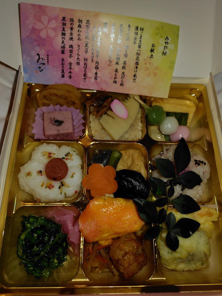 お弁当って開いた時に【あらぁ まぁ 美味しそう!】って思わずニコッとするようなモノを出来れば食べたい!今回、購入したのは、神田明神下 みやびのお弁当。みやび桜 この季節の限定内容とのこと。お献立は…桜胡麻豆腐 紅花塩漬け載せレンコンきんぴらあさりに煮焼き筍茶飯花びら餅花型白飯五色胡麻柔らか梅卵焼き三色団子 煮物として高野豆腐里芋こんにゃく 青実 花人参がんもどき 花型赤飯 【黒ゴマ、桜朧のせ】胡麻わかめさくら大根鮭の黄金焼き鶏団子きんぴらゴボウ黒潮真鯛の天ぷら あおさ真薯とーても気分は春気分になりました。4月1日には、雪が降るし山形の春はまだ、感じられませんね…山形市南館2の1の8心と身体のリラクゼーション眠れる森023‐646−8633