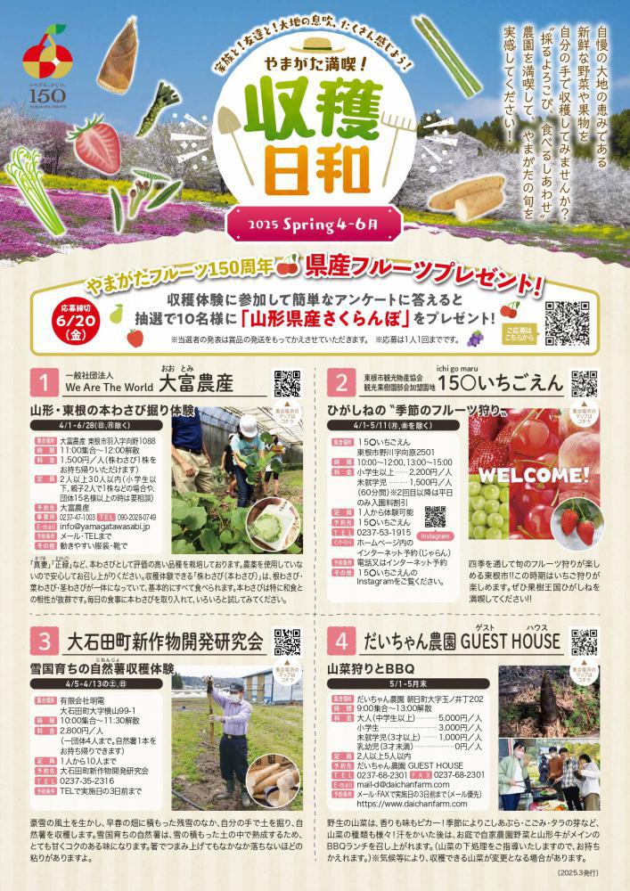 旬の野菜や果物の収穫体験ができる企画「やまがた満喫!収穫日和」の春企画が始まります! 春企画では、本わさび、イチゴ、自然薯、山菜、ワラビ、アスパラ、じゅん菜など、農園自慢の野菜や果物が収穫できます。 ぜひご家族やお友達と春の思い出作りにお越しください! 【やまがたフルーツ150周年 県産フルーツ プレゼント!】 収穫体験に参加して簡単なアンケートに答えると、抽選で10名様に「山形県産さくらんぼ」をプレゼントします! 6月20日(金)まで、チラシのQRコードからご応募ください。 【参加農園】 ※収穫体験の内容や予約先などの詳細は、チラシ(PDF)をご覧ください。 ・一般社団法人We Are The World大富農産(本わさび掘り体験) ・東根市観光物産協会観光果樹園部会加盟園地(150いちごえん:いちご狩り) ・大石田町新作物開発研究会(自然薯の収穫体験) ・だいちゃん農園GUEST HOUSE(山菜狩りとBBQ) ・間沢観光わらび園(わらび採り) ・農場 喜左ェ門(アスパラ収穫) ・ほその村(山菜収穫体験) ・山の内わらび園(わらび採り) ・大井沢ワラビ園(わらび採り) ・(株)大高根じゅん菜採取(じゅん菜摘み)