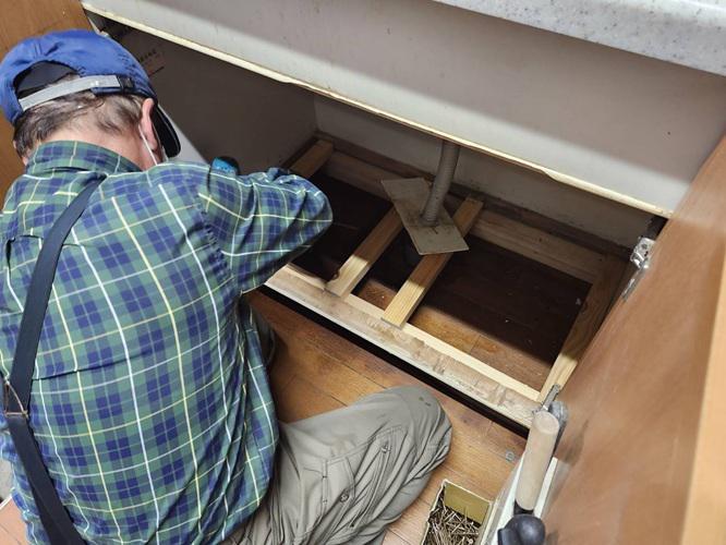みなさん こんにちはリフォーム部の遠藤です今回ご紹介する案件は、キッチンの漏水修理です料理をしていると、足元のスリッパがなぜか濡れているよく見ると、床材の色が変色している・・・キッチンのキャビネット下部から伝っているような・・年末に排水管が詰まってセルフ修理した時になにかが外れたか・・・このようなご相談でした確認したところ、キャビネットの下のSUSの板はすでに変形しておりましたSUSの板を剥し確認しましたが、予想される排水部からの漏水は確認できずもっと後ろから漏れている状態でしたなので背面パネルをはずしてみると・・・原因はこれでしたシャワー付きシングルレバー混合水栓のシャワーホース部の経年劣化によりホースの亀裂からの水漏れでした急遽、水栓を交換し漏水で汚れた床の清掃、新なキャビネット下地、コンパネ板を設置解体することで本当の原因が発見され、またすぐに水栓の交換もできてお客様からもよろこんで頂けました よかったです!