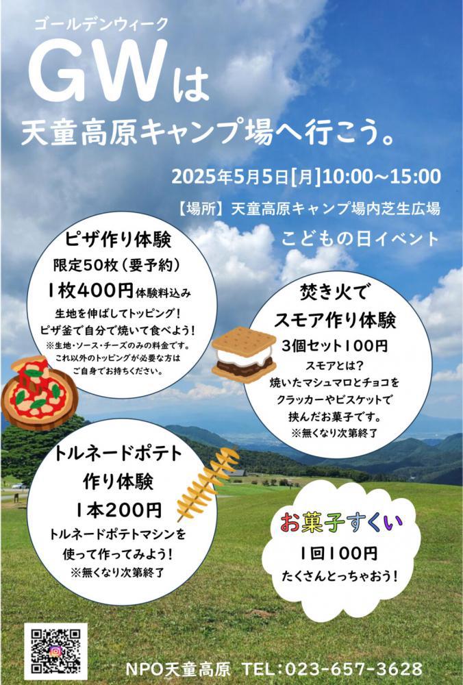 2025年5月5日(月・祝)のこどもの日、天童高原キャンプ場の芝生広場で、家族で楽しめる体験イベントが開催されます。自然に囲まれた開放的な空間で、ピザ作りやスモア体験など、わくわくのアクティビティが目白押し!体験メニュー(一部予約制) 〈ピザ作り体験(要予約)〉 生地を伸ばしてトッピング!ピザ釜で焼いたアツアツのピザが楽しめます(1枚400円/限定50枚)。 〈スモア作り体験〉 焚き火で焼いたマシュマロをチョコとクラッカーでサンド。3個セット100円で、アウトドア気分が味わえます! 〈トルネードポテト作り体験〉 くるくる回るポテトを自分で作れる楽しい体験(1本200円)。 〈お菓子すくい〉 1回100円で、どれだけすくえるかチャレンジ!アクセス情報天童高原キャンプ場は、天童市街地から車で約30分。カーナビをご利用の方は「天童高原キャンプ場」で検索いただくと便利です。※無料駐車場完備予約方法についてピザ作り体験は事前予約制・限定50枚となっております。参加をご希望の方は、下記までお電話にてご予約ください。予約・問い合わせ先:NPO天童高原 TEL:023-657-3628青空の下で楽しめる体験がいっぱい。ピクニック気分で気軽に参加できるのも魅力です。ゴールデンウィークの思い出作りに、ぜひ天童高原キャンプ場へ!詳しくはこちら(天童高原公式ページ)