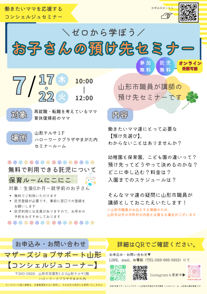 コンシェルジュセミナー「ゼロから学ぼう! お子さんの預け先」を開催します! 幼稚園と保育園、こども園の違い、申請手続きについて、保育料について、入園までのスケジュールなどゼロから学べます!講師は、山形市保育育成課の職員さんです。これから、お子さんの預け先を決めようとしているママたち、どうぞお気軽に、ご参加ください! ※山形市職員がお伝えする情報のため 山形市以外の市町村の内容とは 異なる場合がございます。 ご了承ください。 ●ご自宅でオンライン受講ご利用の方へ●・インターネット環境が必要になります。 通信料は自己負担です。・パソコン、スマートフォン、 またはタブレットをご準備いただき、 事前にZoom meetingsを ダウンロードしてください。・セミナー中はカメラをオンにし、 お顔の見える状態で受講して下さい。 また、マイクで会話による現状確認が できる形でご受講をお願いしております。 【日時】 7月17日(木)または22日(火) 10:00〜12:00【会場】 ハローワークプラザやまがた内 会議室 または オンライン受講【託児】 あり(セミナールームで受講の方のみ) お早めにご予約ください【受講料・託児料】 無料 □お問い合わせ□マザーズジョブサポート山形【コンシェルジュコーナー】◇電話でのお申込み→023-665-5915◇お申込みメール→コチラ◇LINEでのお申込み→トーク画面にて・お名前・お申込み講座・託児の有無・お電話番号を送信してください。返信をもって申込完了となります。↓公式LINE追加はこちら↓☆メール・LINE・電話での対応は 開庁日のみとなります。 メール、LINEは開庁時間内で 返信いたします。