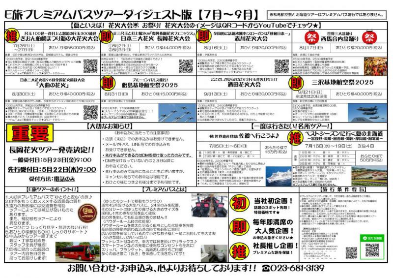 皆様お待たせ致しました!! プレミアムバスツアーダイジェスト版【7月〜9月】ができましたのでご確認ください(^^)/気になる方はまずは資料請求を♪ ここがいい!プレミアムバスツアーのポイント★@ゆったりシートでらくらく♪座席数を減らし、1席1席を広くしたことで通常の夜行バスよりゆったり快適な睡眠が得られます(^^)/嬉しいコンセント完備! A化粧室付きなので安心♪化粧室内にはおしゃれなパウダールームも(^^)/長距離でも安心! お問い合わせ、お申込みお待ちしております(^^♪お電話でのお問い合わせは023−681−3139まで♪メールでのお申込みはお早めに(^^)v