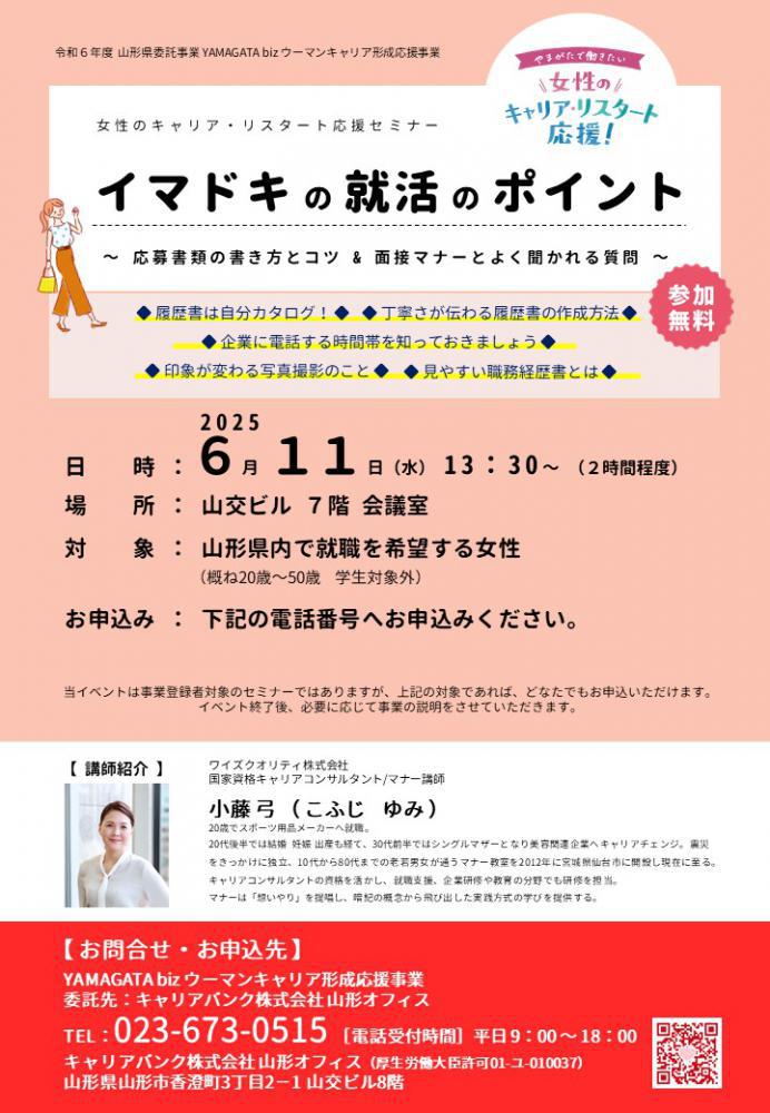 応募書類がなかなか通らない面接でいつも落とされてしまう・・・。など 就職活動が上手くいかないなど、お困りがある方は、応募から面接までの対策に備えるセミナー「イマドキの就活のポイント」に是非ご参加ください。 どのようにしたら印象の良い応募書類になるのか、また好感度アップになるマナーや、面接のポイントなど応募前に押さえておくと、合格率がアップするかもしれません。 参加ご希望の方は、お電話にてお申込みください。 【お申込み先】キャリアバンク株式会社 山形オフィス023-673-0515 (女性支援担当宛) 【電話受付時間】平日 9:00〜18:00 日時 6月11日(水)13:30〜(2時間程度)会場 山交ビル7階 会議室(駐車場は、山交ビル指定の駐車場をご利用ください。) お気軽にお電話ください。お待ちしています。