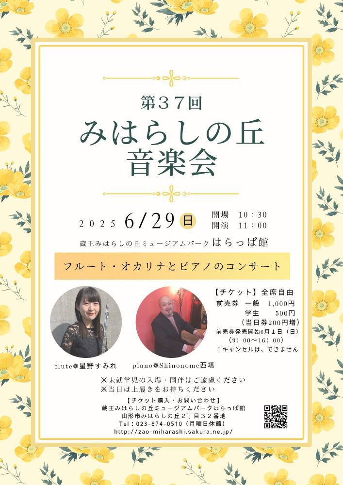 今回は、フルート奏者の星野すみれさんを招き、フルートだけではなく、ピッコロとオカリナの音色もご披露してくださることに。ピアノソロは、「Danny Boy」です。  このコンサートは、リピーターのお客さんが多いです。理由は、「心が癒される」や「元気になる」などの自分の心に栄養補給になるから、だと思われます。みなさんもいかがですか?添付のチラシをよくお読みになって、「はらっぱ館」または出演者からチケットをご購入ください!!