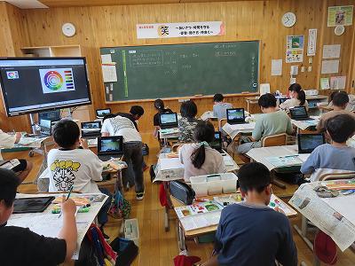 4年生の図工では、タブレットに好きな風景を写真に撮り、それを見ながら色を作り塗っていく水彩画の学習をしていました。木の色をうまく表現している子供たちもたくさんいました。これかなと思う絵具を混ぜていろいろな色を発見する楽しい授業です。